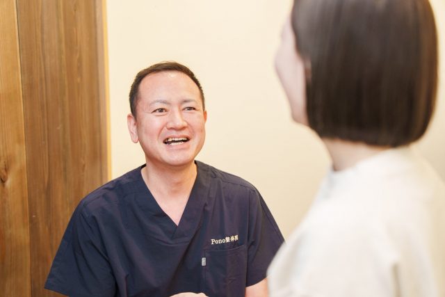 Pono整体院では、私の背中の状態を詳しく確認してくれ、原因にアプローチする施術を行ってくれます。短時間の施術でも、背中が楽になり、姿勢が良くなったのを実感しています。