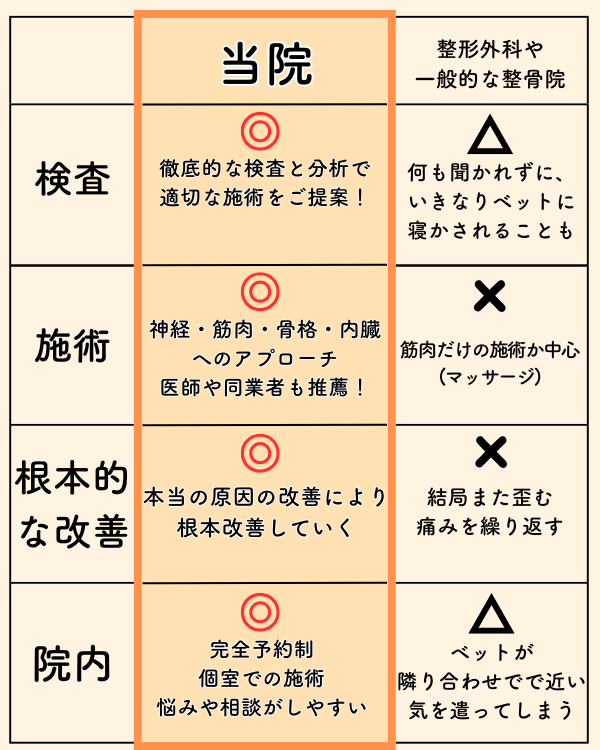 そのような異常が見られないケースでは、体のゆがみやバランスの問題が原因となっていることが多く、これは整体の得意分野です。結果として、病院で改善しなかった症状が整体で改善されることもよくあります。