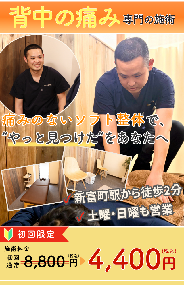 銀座新富Pono整体院では、徹底したカウンセリングと検査を通じて、あなたの症状の根本原因を特定し、お身体の状態に最適な施術を提供しています。初めての方でも安心していただけるよう、お得な初回特典もご用意しておりますので、「まずは試してみたい」という気持ちでお気軽にご来院ください。