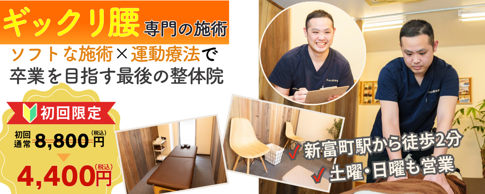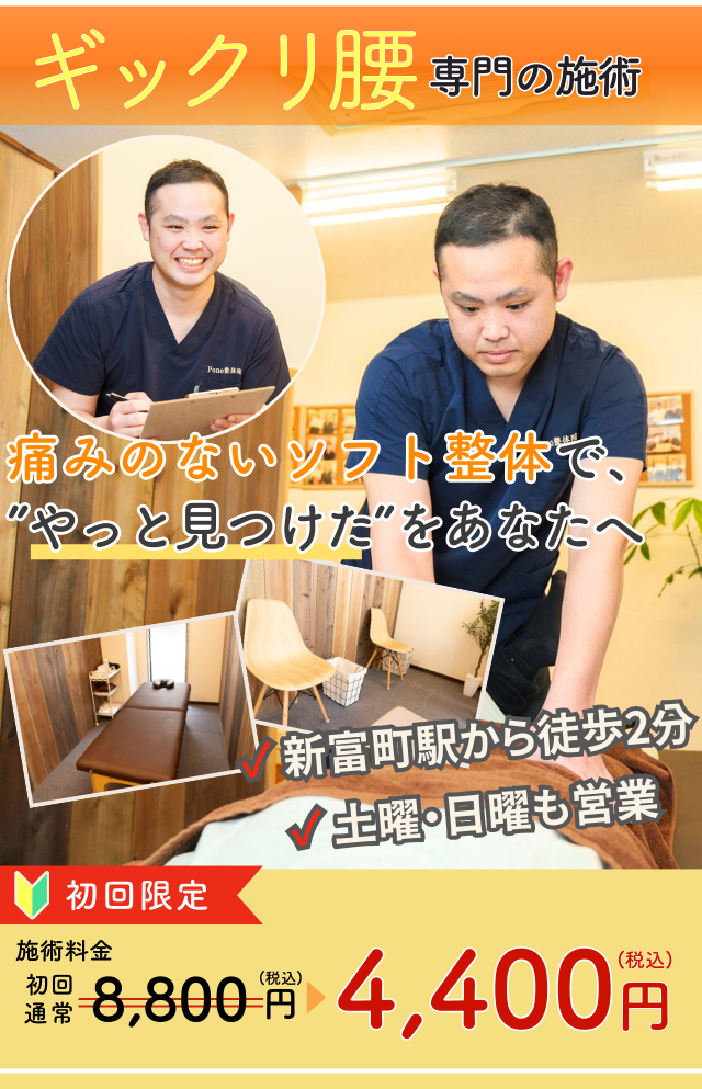 個々の症状に合わせた丁寧な施術で、ギックリ腰の改善をお手伝いし、快適な日常生活を取り戻しましょう!